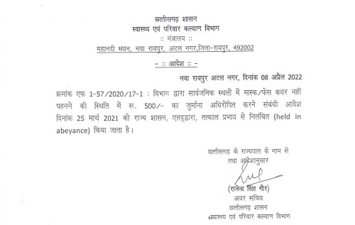 स्वास्थ्य एवं परिवार कल्याण विभाग द्वारा 25 मार्च 2021 को जारी सार्वजनिक स्थलों में मास्क या फेस कवर नहीं पहनने पर 500 रुपए का जुर्माना अधिरोपित करने संबंधी आदेश को राज्य शासन ने तत्काल प्रभाव से निलंबित (held in abeyance) कर दिया है। मंत्रालय द्वारा इस संबंध में विगत 8 अप्रैल को आदेश जारी किया गया है।