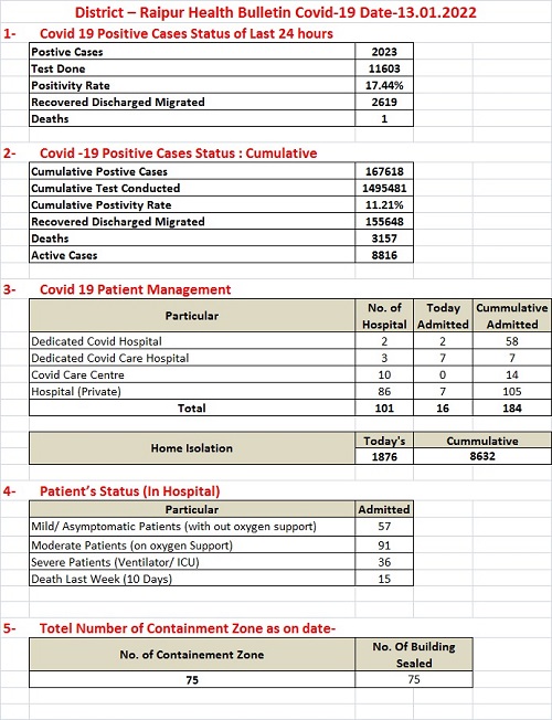 बता दें कि आज रायपुर में 11603 सैम्पलों की जांच हुई जिसमें 2023 लोग कोरोना पॉजिटिव पाए गए है. रायपुर में पॉजिटिविटी रेट 17.44 प्रतिशत पहुँच गई है. आज पाए गए मरीजों को मिलकर रायपुर में कुल 8816 एक्टिव मरीज हैं. रायपुर जिले में टोटल 75 कन्टेनमेंट जोन घोषित किये गए हैं.