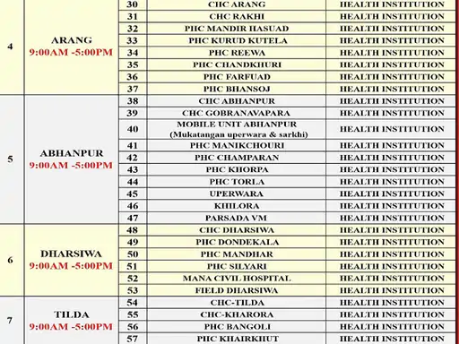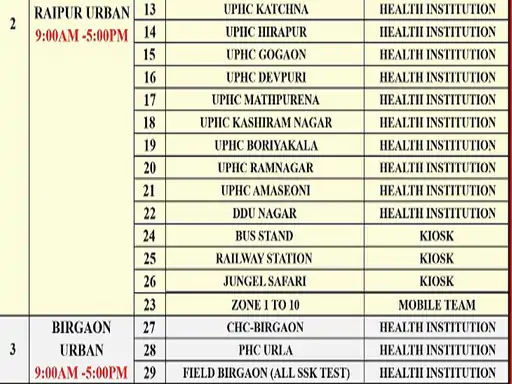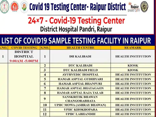 रायपुर शहर के ग्रामीण, बीरगांच, आरंग, अभनपुर, धरसींवा और तिल्दा में दर्जनों सेंटर्स हैं जहां कोरोना की जांच सुबह 9 बजे से शाम 5 बजे तक नि:शुल्क की जाती है। जांच से जुड़ी दूसरी जानकारियों के लिए जिला कंट्रोल रूम के नंबर 07712445785, 7880100331, 7880100332 पर संपर्क किया जा सकता है।