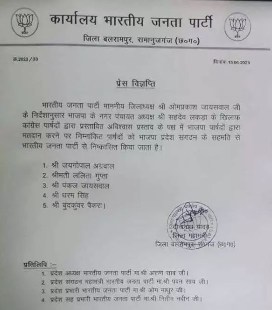 बलरामपुर से बड़ी खबर सामने आयी हैं, यहां भाजपा ने 5 पार्षदों को पार्टी से निष्कासित कर दिया हैं। दरअसल, कुछ समय पहले भाजपा के कुछ पार्षदों ने कांग्रेस के अविश्वास प्रस्ताव के पक्ष में मतदान किया था। इसलिए ऐसे पार्षदों को भाजपा ने चुनाव से पहले निष्कासित कर दिया है। बता दें, भाजपा जिलाध्यक्ष ओमप्रकाश जायसवाल ने सभी पार्षदों पर कार्यवाही की हैं।राजपुर नगर पंचायत में पार्षदों का 12 मई को फ्लोर टेस्ट किया गया था। फ्लोर टेस्ट के दौरान भाजपा के 5 पार्षदों में बगावत की बात आ गई थी। जिसके बाद उन्हें भाजपा में नहीं रहने देने का फैसला किया गया था। पार्टी के खिलाफ कार्य करने को लेकर इन सभी पर कार्यवाही की गई है।