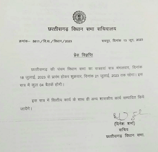 छत्तीसगढ़ विधानसभा का मानसून सत्र 18 जुलाई से शुरू होगा। मानसून सत्र में कुल चार बैठकें होगी।18 जुलाई से शुरू होगा मानसून सत्र, विधानसभा सचिवालय ने जारी की अधिसूचना