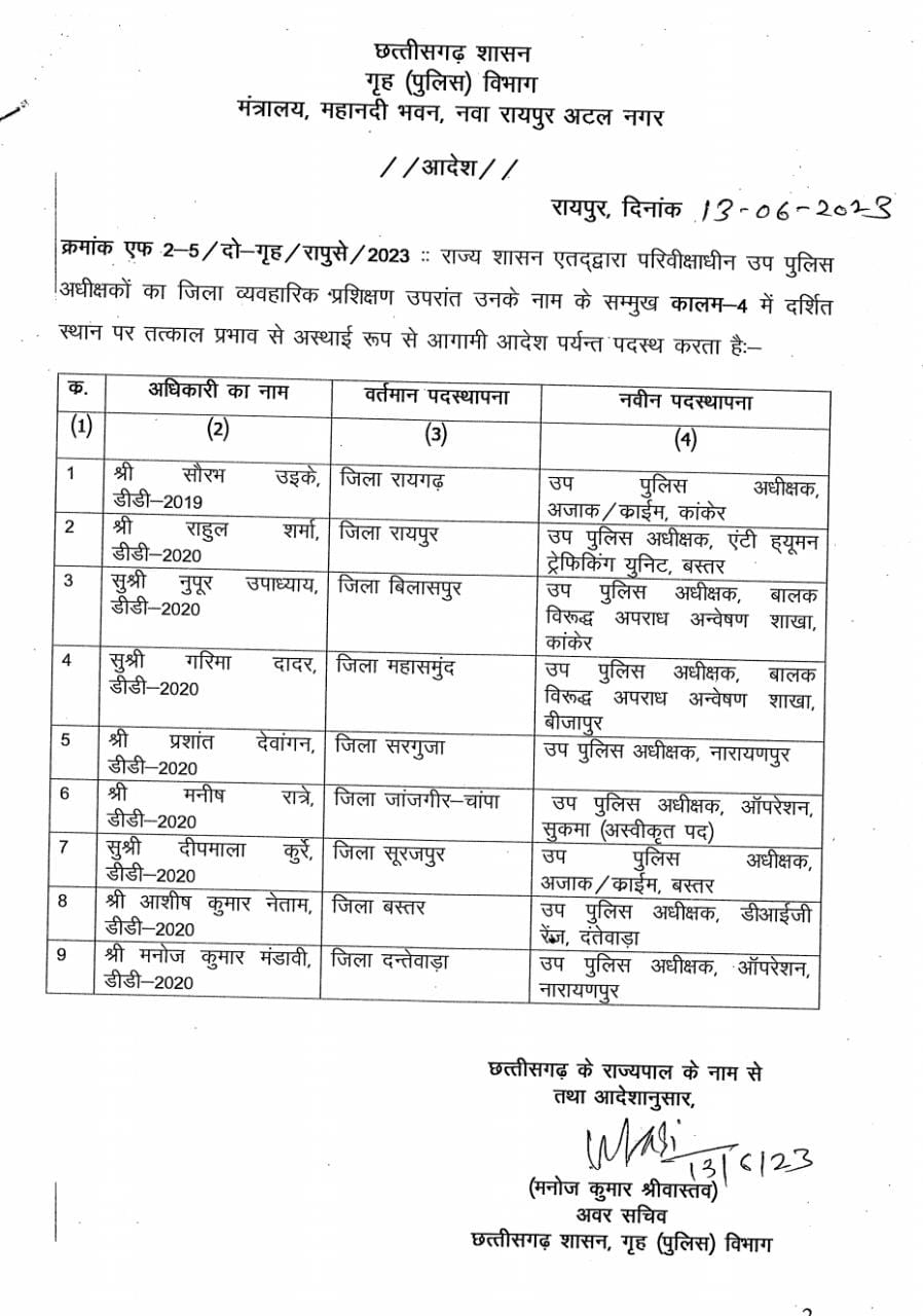 छत्तीसगढ़ शासन की ओर से राज्य में पदस्थ परिवीक्षाधीन उप पुलिस अधीक्षकों का जिला व्यवहारिक प्रशिक्षण उपरांत नवीन पदस्थापना का आदेश जारी किया हैं। इस आदेश में प्रदेश के अलग-अलग जिलों में पदस्थ 9 पुलिसकर्मियों का नाम शामिल हैं। इस आदेश में प्रदेश के अलग-अलग जिलों में पदस्थ 9 पुलिसकर्मियों का नाम शामिल हैं।