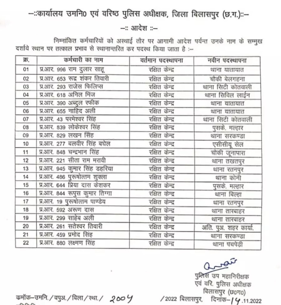 बिलासपुर एसएसपी पारुल माथुर ने एक साथ 52 पुलिस कर्मियों का ट्रांसफर किया है। इनमें 30 कॉन्स्टेबल और 22 हेड कॉन्स्टेबल शामिल है। सोमवार को इस संबंध में आदेश जारी कर दिए गए हैं।
