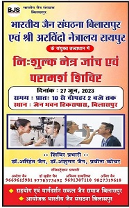 सकल जैन समाज, बिलासपुर के सहयोग एवं मार्गदर्शन में आयोजित शिवर में 26 जून सोमवार को बाल्को मेडिकल सेंटर द्वारा नि:शुल्क कैंसर जांच एवं परामर्श, परीक्षण एवं सलाह शिविर लगेगाा। वहीं 27 जून मंगलवार को रायपुर के नेत्र चिकित्सालय अरविंदो नेत्रालय के माध्यम से आंख से संबंधित बीमारियों का परीक्षण एवं सलाह दिया जाएगा।
