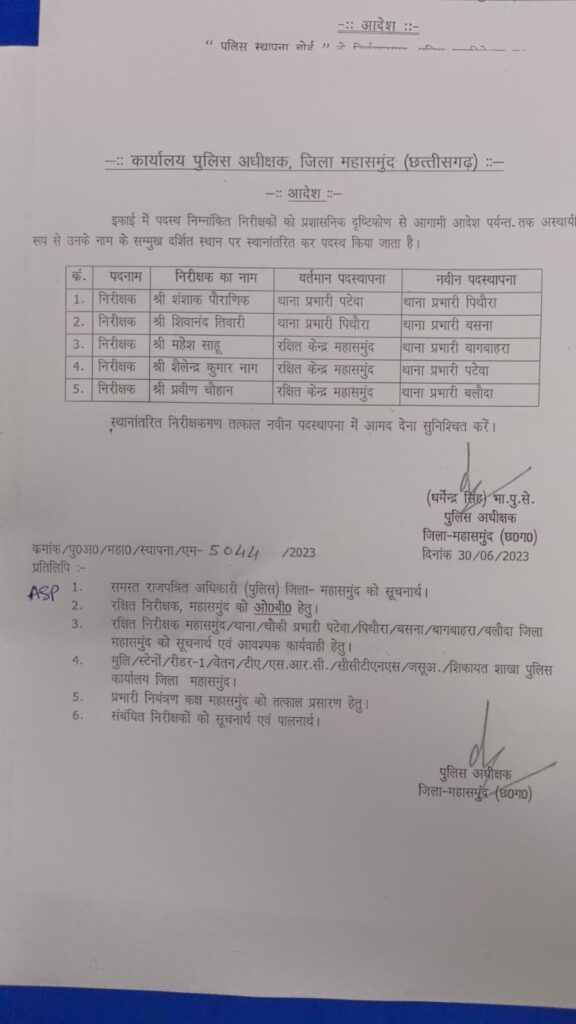 महासमुंद जिला एसपी ने 5 निरीक्षकों का तबादला किया गया है