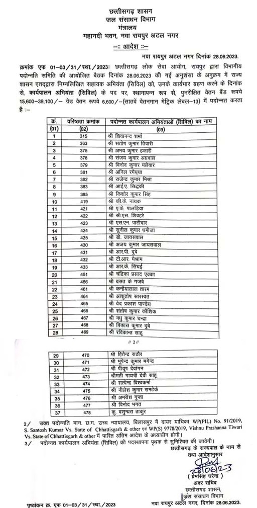छत्तीसगढ़ में जल संसाधन विभाग के इंजीनियरों की प्रमोशन लिस्ट आज जारी की गई है। जिसमें 37 असिस्टेंट इंजीनियरों को प्रमोशन देकर EE यानि एग्जीक्यूटिव इंजीनियर बनाया गया है। मंत्रालय से इस संबंध में आदेश जारी किया गया है। छत्तीसगढ़ लोक सेवा आयोग द्वारा विभागीय पदोन्नति समिति की बैठक में हुई अनुशंसा के बाद ये लिस्ट जारी की गई है।