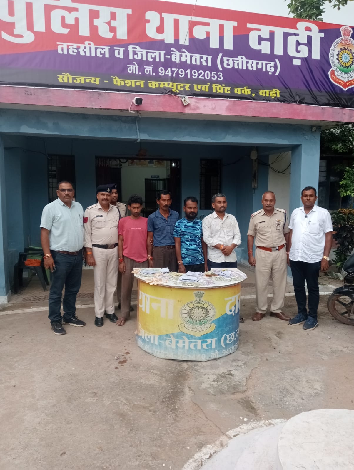 आगामी विधान सभा चुनाव के मद्देनजर पुलिस अधीक्षक श्रीमती भावना गुप्ता (भा.पु.से.) के निर्देशन एवं अतिरिक्त पुलिस अधीक्षक पंकज पटेल, सायबर सेल नोडल अधिकारी एवं एसडीओपी बेमेतरा मनोज तिर्की के मार्गदर्शन में बेमेतरा पुलिस द्वारा अवैध शराब, गांजा, नशीली पदार्थो, प्रतिबंधात्मक कार्यवाही, बाउंड ओवर, गुंडा बदमाशों, फरार वारंटीयों एवं सामाजिक सौहार्द बिगाडने वालों पर लगातार कार्यवाही की जा रही है। जिसके तहत दिनांक 05.09.2023 को थाना दाढी क्षेत्रांतर्गत शराब भट्ठी के पास चखना दुकान दाढी में आमजगह पर विभिन्न नम्बरो पर रूपये पैसो का दांव लगाकर सट्टा-पट्टी लिख रहा है कि सुचना पर सायबर सेल बेमेतरा टीम एवं थाना दाढी स्टाफ पहुच कर सुचना के अधार पर रेड कार्यवाही किया गया, रेड कार्यवाही के दौरान चार आरोपियो को विभिन्न नम्बरो पर रूपये पैसो का दांव लगाकर सट्टा-पट्टी लिखते पकडा गया। थाना दाढी में जुआ सट्टा का 01 प्रकरण दर्ज कर 04 आरोपियों के विरूद्ध धारा 6 छत्तीसगढ़ जुआ (प्रतिषध) अधिनियम 2022 के तहत कार्यावाही की गई हैं। आरोपियों के पास से कुल जुमला नगदी रकम 28,630/- रूपये एवं सट्टा-पट्टी जप्त किया गया हैं।