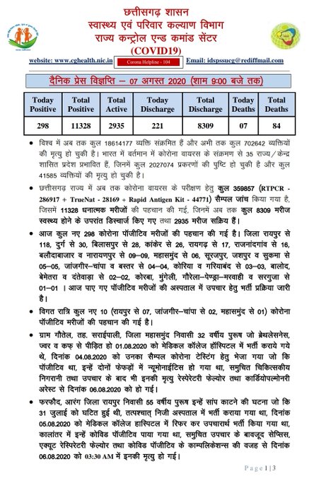 आज प्रदेश में कुल २९८ नए मरीजों की पह्चान की गयी है और ७ मौत भी दर्ज की गयी है इन मरीजों में जिला रायपुर से ११८,दुर्ग से ३०,बिलासपुर से २८,रायगढ़ से १७ ,राजनंदगांव से १६,बलौदाबाजार ९,नारायणपुर से ९ ,महासमुंद से ६,सूरजपुर से ५,जशपुर से ५,सुकमा से ५ ,जांजगीर चांपा से 4,बस्तर से 4,कोरिया से 3,गरिय्बंद से 3,बालोद से २ ,बेमेतरा से २,दंतेवाडा से २ ,कोरबा से 1 मुंगेली से 1 गौरेला-पेंड्शारा-मरवाही से 1 , सरगुजा से 1 शामिल हैं