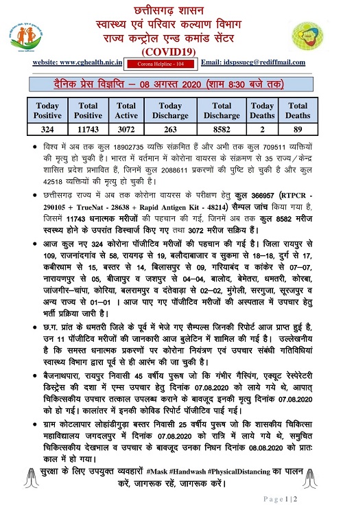 आज प्रदेश में ३२४ नए कोरोना मरीज पाए गए ,वहीं आज २ की मौत कोरोना की वजह से हुयी है आज पाए जाने वाले मरीजों में से रायपुर से १०९,राजनांदगांव से ५८,रायगढ़ से 19,बलौदाबाजार से १८,सुकमा से१८,दुर्ग से १७ , कबीरधाम से १५ ,बस्तर से 14,बिलासपुर से ९,गरिय्बंद से ७,कांकेर से ७,बीजापुर से 4 ,जसपुर से 4,बालोद बेमेतरा धमतरी कोरबा जांजगीर-चांपा कोरिया बलरामपुर दंतेवाडा से २ २ ,मुंगेली सरगुजा सूरजपुर से 1 शामिल है