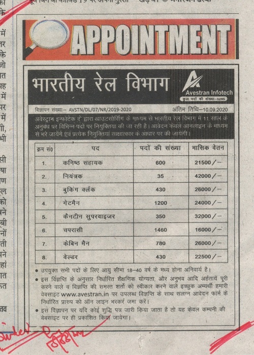 रेल मंत्रालय के ध्यान में आया है कि "अवेस्ट्रान इन्फोटेक" के नाम से एक संस्था www.avestran.in वेबसाइट के पते पर 8 अगस्त 2020 को एक प्रमुख समाचार पत्र में एक विज्ञापन दिया है जिसमें कुल 5285 नंबर के खिलाफ आवेदन मांगे गए हैं। 11 साल के अनुबंध पर भारतीय रेलवे में आउटसोर्सिंग के आधार पर आठ श्रेणियों में पद। आवेदकों को ऑनलाइन शुल्क जमा करने के लिए Rs.750 / -सुविधा जमा करने के लिए कहा गया है और आवेदन प्राप्त करने की अंतिम तिथि 10 सितंबर 2020 के रूप में उल्लेख किया गया है। यह सभी को सूचित किया जा सकता है कि किसी भी रेलवे भर्ती के लिए विज्ञापन हमेशा भारतीय रेलवे द्वारा ही किया जाता है। किसी भी निजी एजेंसी को ऐसा करने के लिए अधिकृत नहीं किया गया है। प्रश्न में उक्त विज्ञापन जारी करना गैरकानूनी है। इस संबंध में, यह भी स्पष्ट किया जाता है कि भारतीय रेलवे पर ग्रुप 'सी' और पूर्ववर्ती ग्रुप 'डी' पदों की विभिन्न श्रेणियों की भर्ती वर्तमान में 21 रेलवे भर्ती बोर्डों (आरआरबी) और 16 रेलवे भर्ती सेल (आरआरसी) द्वारा की जाती है। और किसी अन्य एजेंसी द्वारा नहीं। भारतीय रेलवे पर रिक्तियां केंद्रीय रोजगार सूचना (CENs) के माध्यम से व्यापक प्रचार देकर भरी जाती हैं।