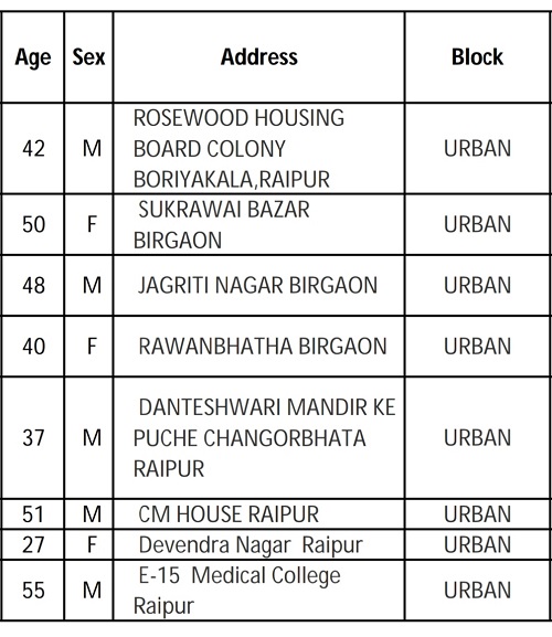 राजधानी रायपुर में आज फिर कोरोना बम फूटा है ,नए मामले रायपुर में अंबेडकर अस्पताल के दो डॉक्टर, सीएमएचओ कार्यालय के दो सीपीएम और डाटा एंट्री ऑपरेटर ,मुख्यमंत्री निवास का एक सूरक्षा गार्ड आज कोरोना पॉजिटिव पाया गया। इसकी ड्यूटी सीएम हाउस के प्रवेश व्दार पर रहती है।,बिरगांव में तीन सब्जी वाले भी पॉजिटिव आने की खबर है,रायपुर में राजभवन के पास रायगढ़ बाड़ा निवासी व्यापारी जो कुछ दिनों पहले कोरोना संक्रमित पाया गया था अब उसकी पत्नी व दो नौकर भी कोरोना की चपेट में आ गए हैं।