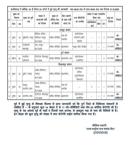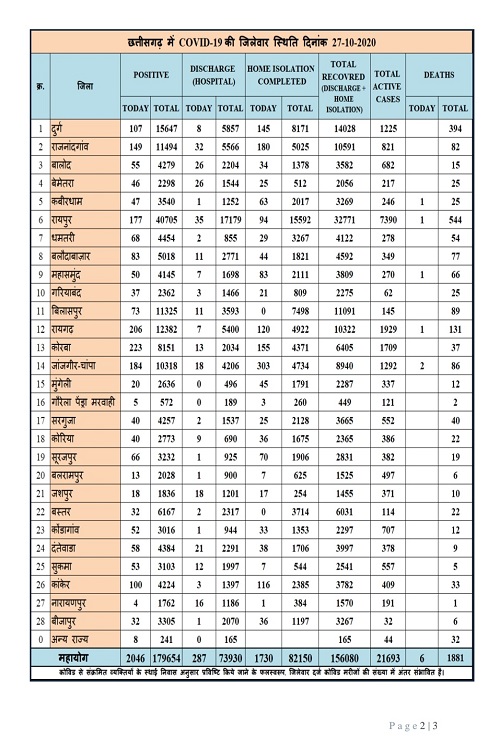 आज मिले कोरोना मरीजों में से कोरबा- 223, रायगढ़- 206, जांजगीर-चांपा- 184, रायपुर- 177, राजनांदगांव- 149, दुर्ग- 107, कांकेर- 100, बलौदाबाजार- 83, बिलासपुर- 73, धमतरी- 68, सूरजपुर- 66, दंतेवाड़ा- 58, बालोद- 55, सुकमा- 53, कोंडागांव- 52, महासमुंद- 50, बेमेतरा- 46, कवर्धा- 47, सरगुजा- 40, कोरिया- 40, गरियाबंद- 37, बस्तर- 32, बीजापुर- 32, मुंगेली- 20, जशपुर- 18, बलरामपुर- 13, गौरेला-पेंड्रा-मरवाही- 5, नारायणपुर- 4 और अन्य- 8 शामिल हैं।
