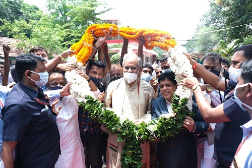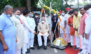 मुख्यमंत्री को बधाई देने पहुंचे नागरिकों ने मुख्यमंत्री को खुमरी और फूलों का हार पहनाकर उन्हें जन्मदिन की बधाई दी और एक बालक अपने पिता के साथ भगवान शिव के भेष में बधाई देने पहुंचा।